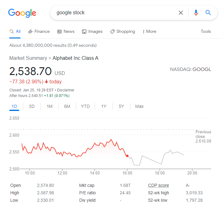 Googleの英語版で Google の株価を検索すると、株価が下がっている時の文字もグラフも赤色ですが、